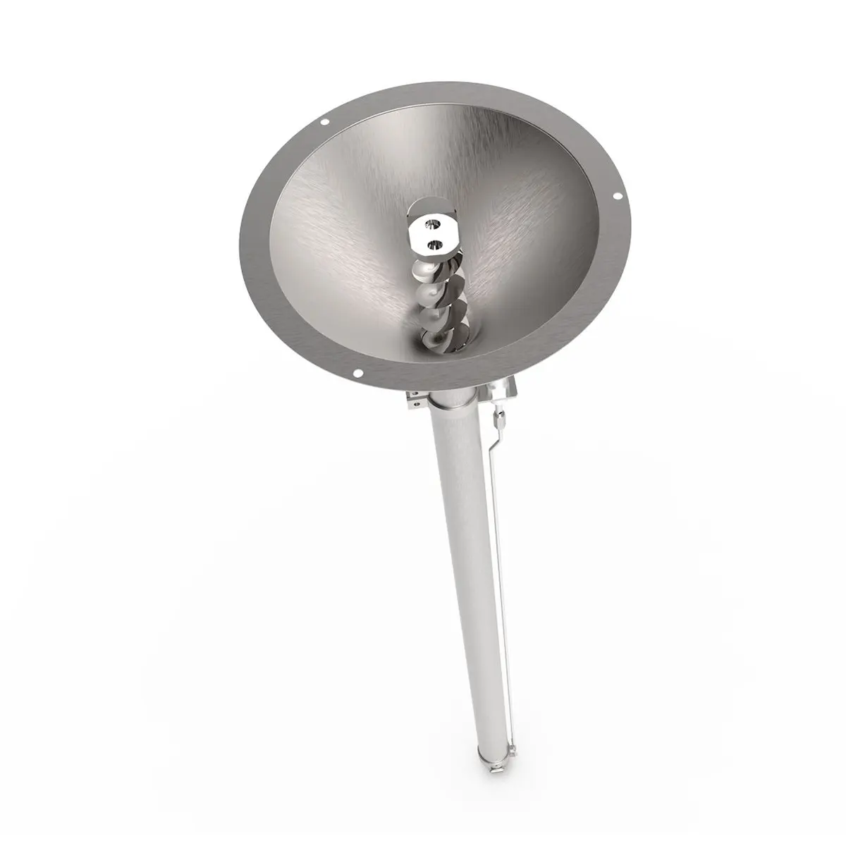 Tanto o tubo do sem-fim quanto o próprio parafuso sem-fim são fabricados em aço inox AISI-304, com acabamento polido brilhante para dificultar a aderência do produto às paredes de aço.