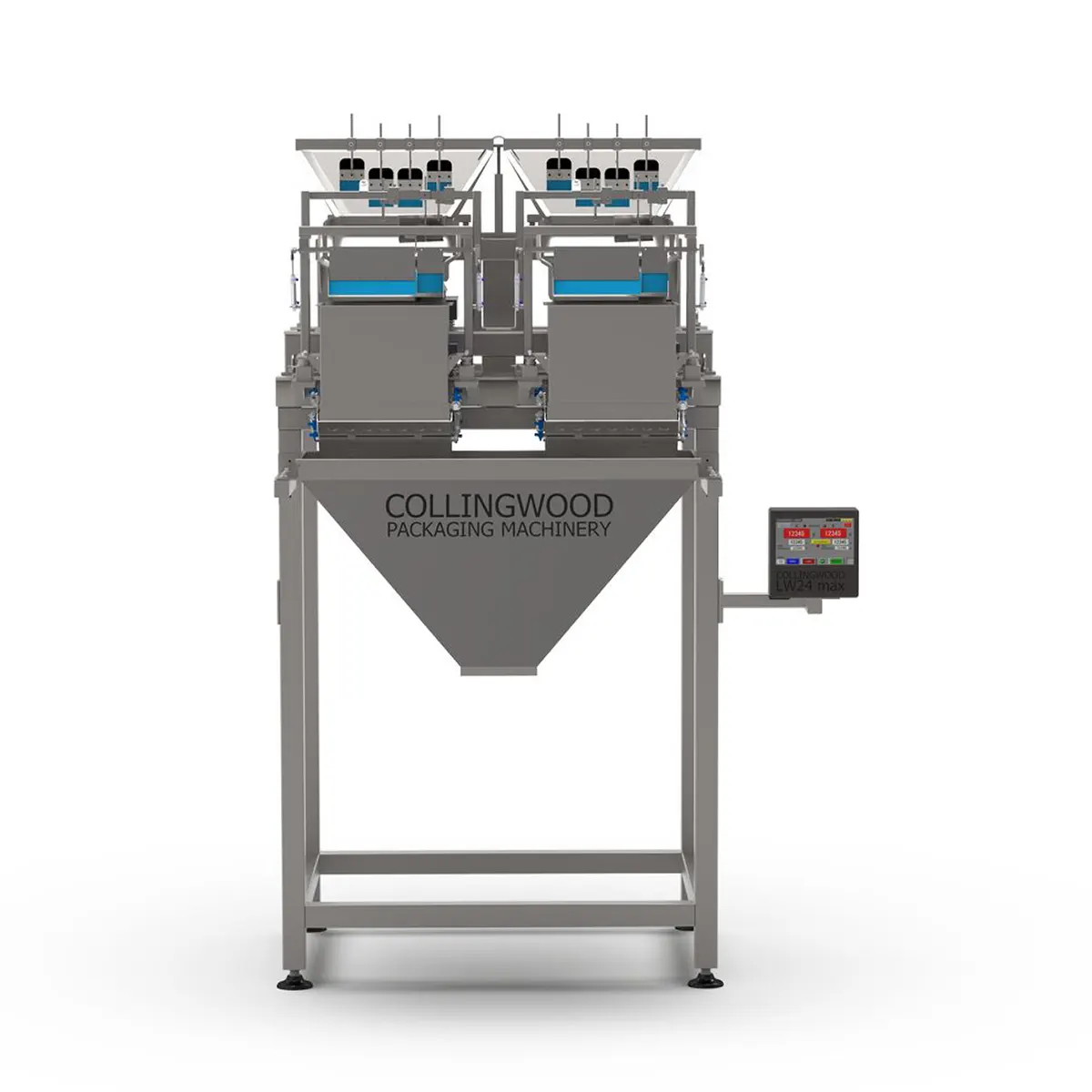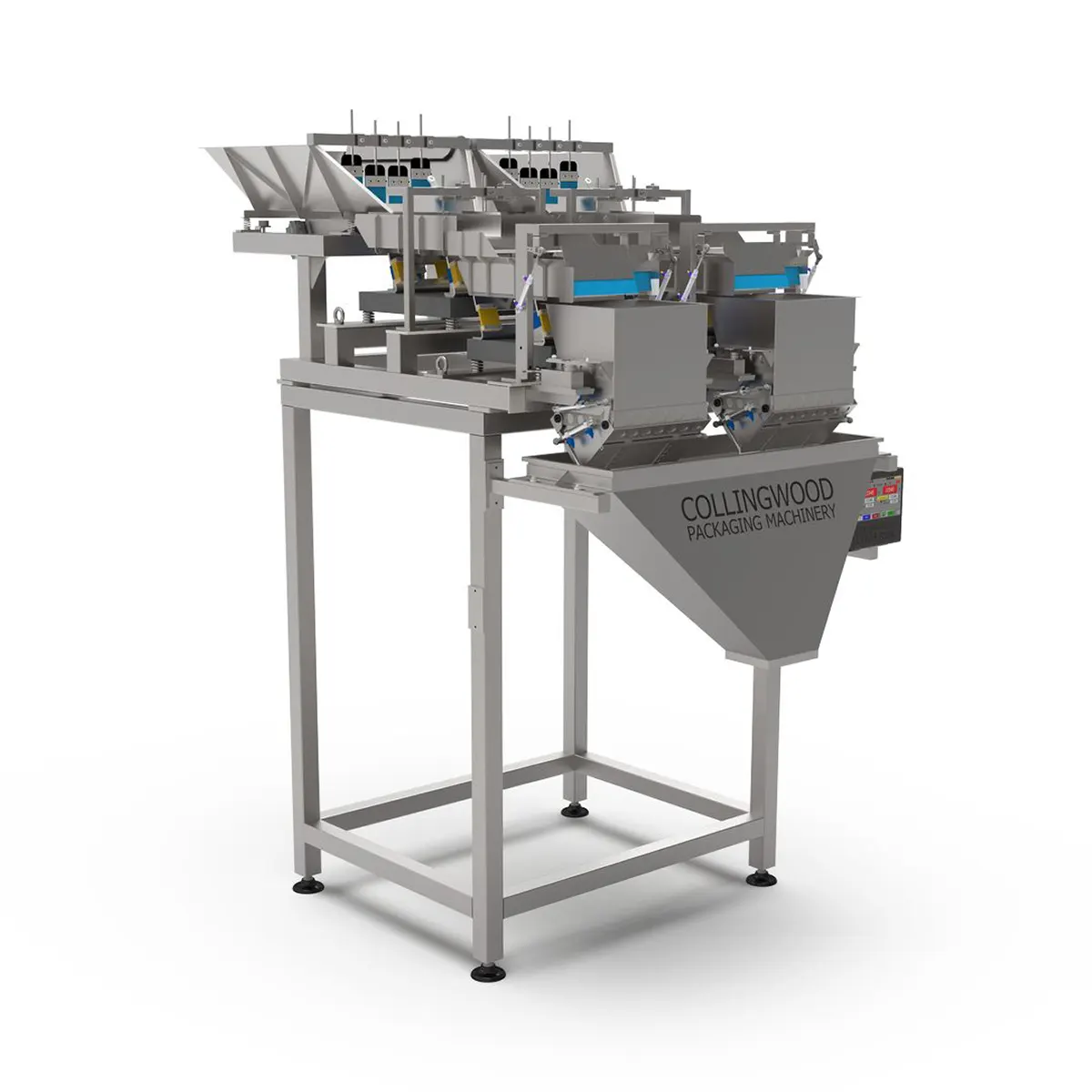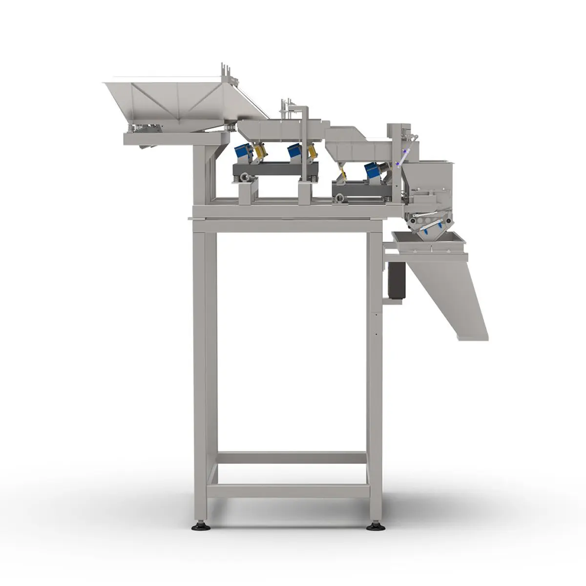 Possui linha de pesagem, com quatro grandes bandejas vibratórias para o avanço do produto a ser pesado.