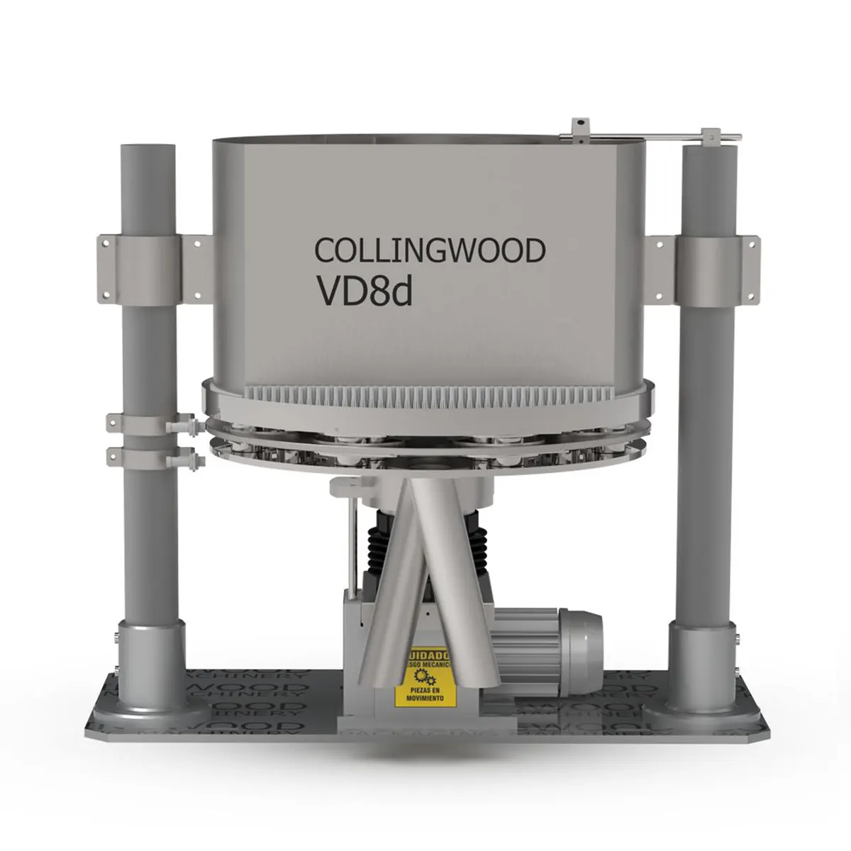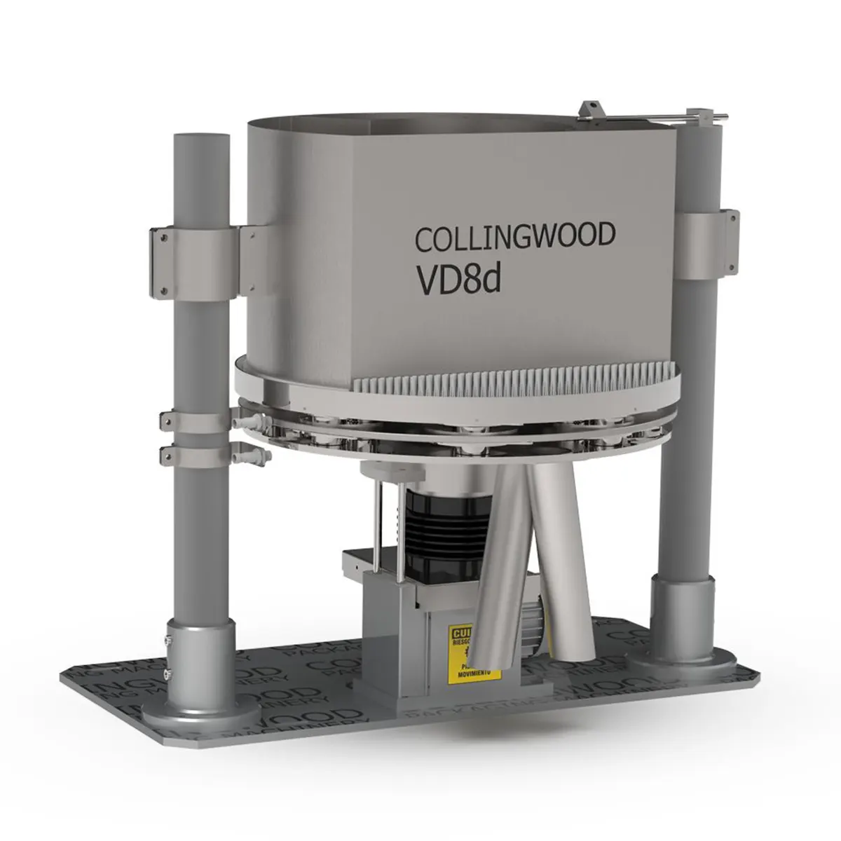 O Doseador volumétrico VD8d possui uma tremonha de recepção de produto que alimenta uma série de 8 taças telescópicas DUPLAS ajustáveis (16 no total) dispostas circularmente.